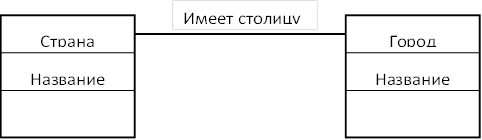 Для представления объектной модели часто используются графические языки спецификации объектов (например, язык UML [15.5]). На таких языках классы и объекты задаются прямоугольниками, которых указывается специфицирующая их информация. Для задания отношений между двумя классами соответствующие им прямоугольники связываются линией, снабженной различными графическими значками и некоторыми надписями. Графические значки специфицируют характер (вид) отношения между этими классами, а надписи обеспечивают полную идентификацию этого отношения (делают его конкретным). Например, на рис. 15.2 заданное отношение между классами Страна и Город имеет характер «один к одному». Более конкретно это отношение означает, что каждый объект класса Страна обязательно связан отношением «имеет столицей» с одним и только одним объектом класса Город, и этот объект класса Город не связан таким отношением ни с каким другим объектом класса Страна.