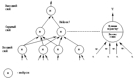 Каждая ИНС состоит из набора нейронов, которые сгруппированы по слоям. Типичная структура ИНС показана на рис.5.11. Здесь представлены три слоя: входной, промежуточный (называемый скрытым слоем) и выходной. Между входным и выходным слоями может быть размещено несколько скрытых слоев.