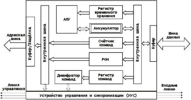 Внутренняя шина соединяет собой основные части МП. С помощью внутренней ШД, работающей в режиме двунаправленной передачи (мультиплексном режиме) происходит соединение МП с ШД микропроцессорной системы, которая служит для выборки команд и обмена данными с памятью, разрядность внутренней шины МП совпадает с разрядностью шины данных МПС.