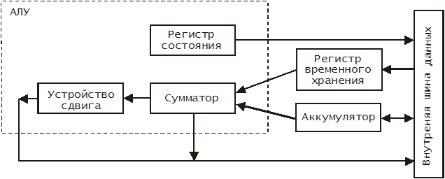 Арифметическо-логическое устройство (рис. 4.2) состоит из двоичного сумматора со схемами ускоренного переноса, сдвигающего регистры и регистров для временного хранения операндов. Обычно это устройство выполняет по командам несколько простейших операций: сложение, вычитание, сдвиг, пересылку, логическое сложение (ИЛИ), логическое умножение (И), сложение по модулю 2. На первый вход АЛУ поступает байт из аккумулятора, а на второй вход – из промежуточного регистра. Результат сложения указанных двух байтов передается с выхода АЛУ через внутреннюю шину данных в аккумулятор.