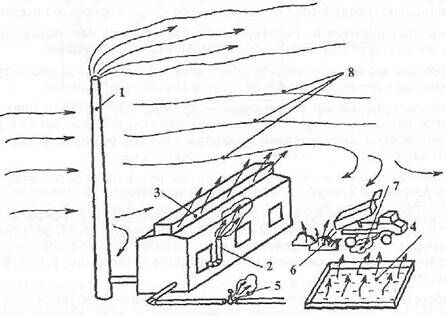1 – высокая дымовая труба; 2 – низкая дымовая труба; 3 – аэрационный фонарь цеха; 4 – испарения с поверхности бассейна; 5 – утечки через неплотности оборудования; 6 – пыление при разгрузке сыпучих материалов; 7 – выхлопная труба автомобиля; 8 – направление движения потоков воздуха