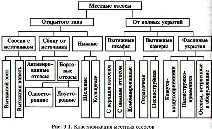 Классификация аспирационных устройств. По степени изоляции области действия отсоса от окружающего пространства различают отсосы открытого типа и отсосы от полных укрытий (рис. 3.1).
