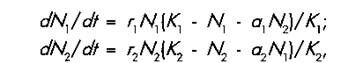 где N1 и N2 - численности двух конкурирующих видов 1 и 2;