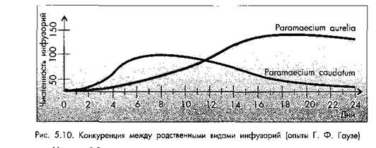 В отсутствие убежищ или других возможностей распределения функций вид, который сильнее подавляет своего партнера, рано или поздно обязательно его вытеснит, независимо от значений коэффициентов конкуренции. Эта закономерность экспериментально была подтверждена российским ученым Г. Ф. Гаузе (1934), который проводил опыты с родственными видами инфузорий – Paramecium aurelia и Paramecium caudatum, поместив их культуры вместе в богатую пищей среду (в одну экологическую нишу). Результаты опытов представлены на рис. 5.10.