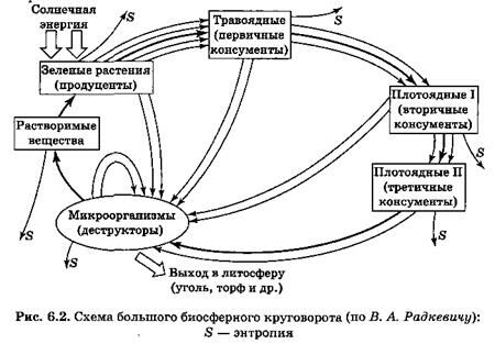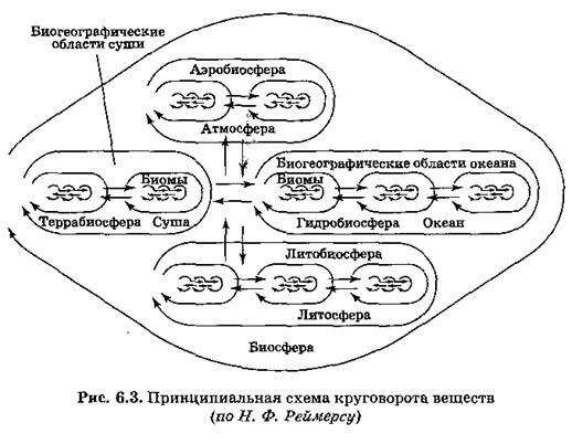 Круговорот биотический — явление не прерывного, циклического, закономерного, но неравномерного во времени и пространстве перераспределения вещества, энергии, информации в пределах экологических систем различного иерархического уровня организации — от биогеоценоза до биосферы. Круговорот веществ в масштабах всей биосферы называют большим кругом (рис. 6.2), а в пределах конкретного биогеоценоза малым кругом биотического обмена.