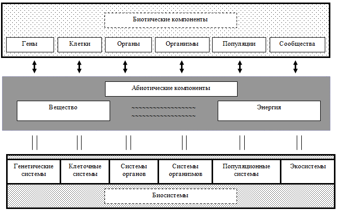 На каждом уровне в результате взаимодействия с окружающей физической средой (энергией и веществом) возникают характерные функциональные системы. Под системой понимается упорядочено взаимодействующие и взаимозависимые компоненты, образующие единое целое.