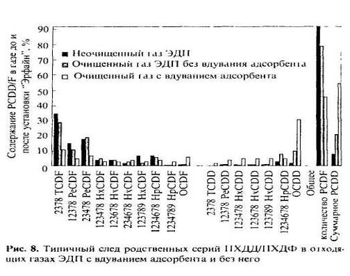 Для эффективной очистки отходящих газов ЭДП сочетание термической обработки, вдувания адсорбента и охлаждения обеспечивает возможность снизить содержание ПХДД/ПХДФ до величин ниже ПДК. С целью оптимизации технологии вдувания адсорбентов исследуются другие реагенты для вдувания, углеродсодержащие и безуглсродистые. При использовании безуглеродистых веществ устраняется опасность возгорания и возникновения взрыва, едовательно, отпадасг необходимость в мерах по технике безопасности.