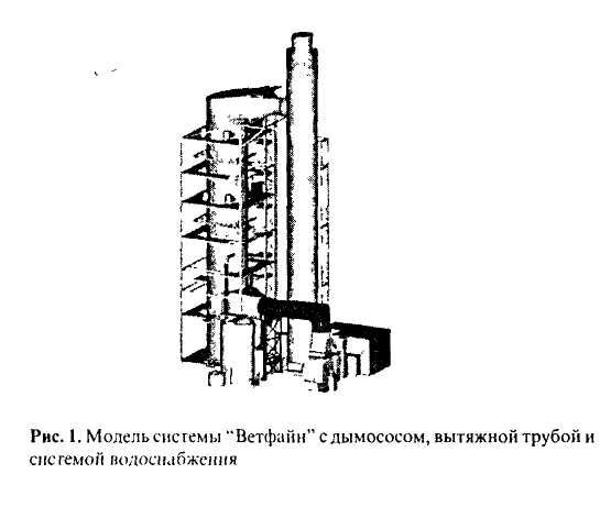 Сначала отходящий газ направляется на душирующее усгройство no принципу противотока. После предварительной очистки он поступает через каплеотделитель в мокрый электрофильтр, а затем через дымовую (выводную) трубу выбрасывается в атмосферу. Система " Ветфайн" спроектирована в соответствии со специфическими требованиями конкретного объекта. Данная система состоит из модулей и рассчитана на большие объемы отходящего газа — свыше 2000 тыс. м3/ч (при стандартных температуре и давлении). Каждый модуль способен перерабатывать поток газа объемом 70 - 300 м'/ч. Таким образом, компоновка системы может быть достаточно гибкой и приспособлена к потребностям предприятия (рис. 1).