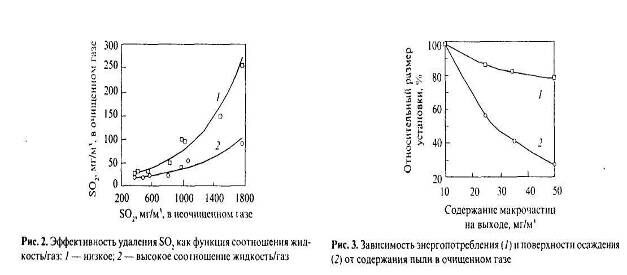 Для десульфурации к циркуляционной воде могут быть добавлены щелочные вещества — известняк СаСО3, известковое молоко Са(ОН)2, гидрооксид магния Mg(OH), или каустическая сода NaOH [2]. Степень десульфурации регулируется с помощью показателя рН и усыновленного соотношения жидкость/газ (рис. 2). Поглощение и частичная конденсация газообразных ПХДД/ПХДФ (диоксинов и фуранов) и других органических компонентов с высокой температурой испарения происходят в процессе охлаждения в душирующей секции. Это значит, что большая часть органических компонентов, поступивших в душирующую секцию в виде газа, превращается в макрочастицы или находится в поглощенном состоянии на поверхности водяных капелек или мельчайших частиц пыли, благодаря чему эти компоненты в значительной степени могут быть удалены из отходящего газа [3].