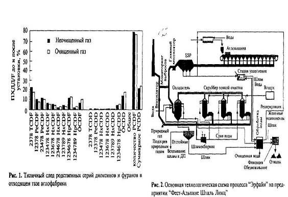 Диоксины (ядовитые органические соединения) образуются как нежелательная побочная продукция при производстве гербицидов или в промышленном процессе горения, выделяющем тепло. Происхождение диоксинов – тепловое или химическое – определяется на основании так называемых “отпечатков пальцев”, которые характеризуют распределение гомологического рчда диоксинов и фуранов. Соответствующие признаки, присущие выбросам аглофвабрик (рис 1) и ЭДП, - типичны для теплового происхождения вследствии реакции органических компонентов и хлорида в отходящем газе. В общем, на образование диоксинов сильное воздействие оказывает объем летучих веществ в шихте.