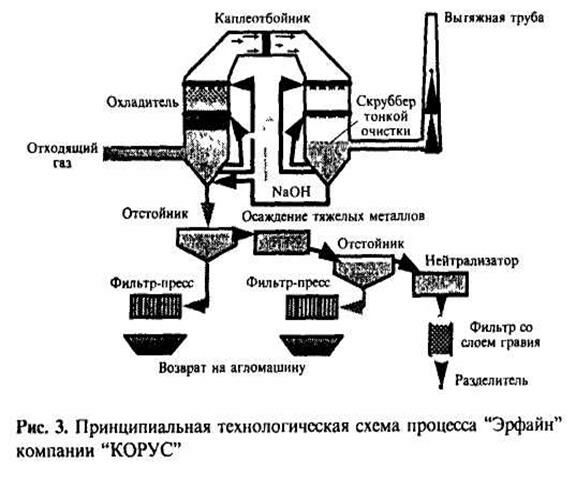 На заводе с полным металлургическим циклом компании "КОРУС" (Эймуйден, Нидерланды), смонтировали единственную установку "Эрфайн" с целью очистки общего объема отходящих газов с трех агломашин. Более того, десульфурацию проводили, вдувая каустическую соду в контур охлаждающей воды (рис. 3).
