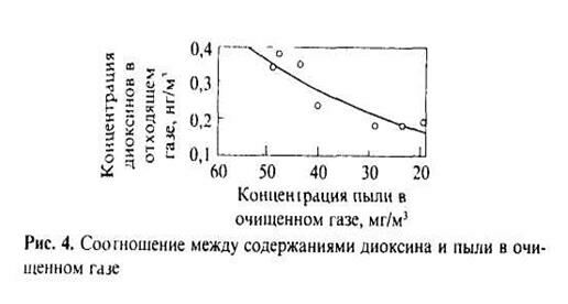 , в связи с этим температурные границы теплового процесса приобретают решающее значение для концентрации выделившегося диоксина. Это означает,что, когда горячие отходящие газы металлургических процессов охлаждаются для очистки, то период времени, требуемый для преодаления температурного интервала, в котором происходит синтез (между 250 и 450