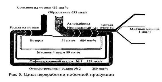 Хлорид железа (III), который добавляют к сбрасываемой воде процесса "Эрфайн", в ходе обработки тяжелых металлов образует большое количество гид- рооксида железа (III), обеспечивающего удаление и последующее осаждение свободных и поглощенных из воды диоксинов. После обработки в камерном фильтр-прессе обезвоженные отфильтрованные осадки № 1 (содержащий нерастворимые твердые частицы) и № 2 (состоящий в основном из природного гипса и небольших объемов тяжелых металлов) могут быть возвращены на агломашину, где большая часть диоксинов распадается (рис. 5). Из маслянистого шлама, скачиваемого с поверхности бассейна-отстойника, удаляют лишнюю воду и возвращают его на аглофабрику.