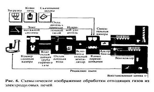 К основным источникам диоксинов на металлургическом предприятии относится также электродуговая печь. Металлолом, используемый для производства стали, обычно привносит масло, пластмассу и другие органические компоненты, поэтому требуется эффективное решение по переработке отходящих газов и устранению проблем, связанных с ними. С внедрением технологий предварительного подогрева металлолома в конце 1980-х годов были разработаны специальные технические решения по очистке отходящих газов с целью борьбы с возросшими объемами летучих органических соединений (ЛОС) и диоксинов, присутствующих в отходящих газах (рис. 6).