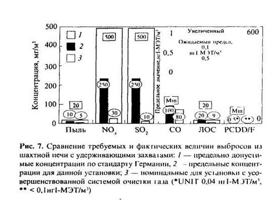 Любые оставшиеся или же вновь образованные органические соединения могут быть удалены вдуванием таких адсорбентов, как активированный уголь и специальные виды кокса (лигнитовый кокс). При этом адсорбенты должны быстро и равномерно распределяться в потоке отходящего газа. Данная технология поглощения в электросталеплавильном производстве, известная под названием "наилучшая имеющаяся технология", минимизирует выбросы органических хлоринов, особенно ПХДД/ПХДФ и ПХД. С помощью этой технологии легко выполняются требования по выбросам пыли, монооксида углерода (СО), вредных компонентов (NOх), диоксида серы (SO2), ЛОС и ПХДД/ПХДФ (рис. 7).