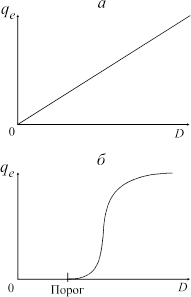 Дополнительный риск, обусловленный присутствием в окружающий среде вредного вещества, зависит от его дозы, поступившей в организм человека. Иными словами, частость дополнительного риска является функцией дозы: qe = f(D). Существуют различные виды зависимости qe от дозы D, два из них представлены на рис. 5.1.