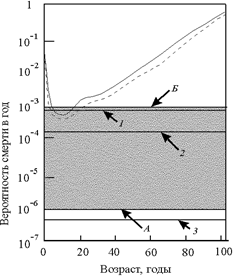 Сплошная кривая — для мужчин, штриховая — для женщин. Горизонтальные линии указывают средний риск смерти в результате: 1 — загрязнения воздуха; 2 — транспортной аварии; 3 — удара молнии. Заштрихована область между уровнями приемлемого (А) и недопустимого (Б) рисков.