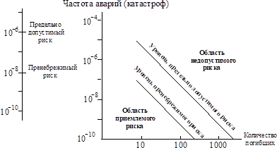 Использование в законодательстве параметров риска требует точного количественного определения двух важнейших понятий максимально допустимого риска и пренебрежимо малого (безусловно приемлемого) риска. Риск признается пренебрежимым, если его уровень в силу своей малости не может быть надежно выявлен на фоне уже имеющихся рисков. В большинстве стран Западной Европы индивидуальный риск, которому подвергается население (а не работающий на производстве персонал), считается пренебрежимым, если его уровень не превышает величину 10-6 за год. Исключение составляют Нидерланды, где значение 10-6 в год считается максимально допустимым риском, а пренебрежимый риск зафиксирован на уровне 10-8 год-1. В США индивидуальный допустимый риск, составляющий 10-6, установлен не для одного года, а для всей жизни человека, средняя продолжительность которой принимается равной 70 годам. Следовательно, ежегодный индивидуальный допустимый риск составляет в США величину, равную 10-6/70 = 1,43×10-8 год-1.