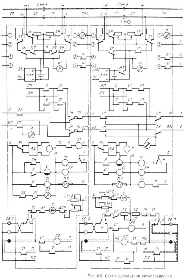 На рис. 6.5 приведена схема однопутной автоблокировки для четырех сигнальных установок перегона. Состояние цепей соответствует нечетному направлению движения и нахождению поезда за светофором 3. Перечень реле, размещенных в релейном шкафу типа ШРУ, приведен ниже.