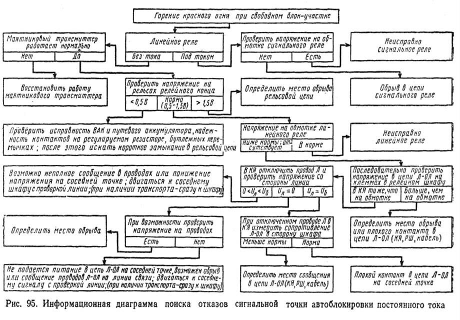 Общая последовательность поиска отказа с питающего конца при ложном запрещающем сигнале приведена в информационной диаграмме (рис. 95). При отыскании повреждения на релейном конце прежде всего проверяют, нормально ли работает импульсное путевое реле и стоит ли под током его повторитель. Обесточенное состояние повторителя при нормальной работе путевого реле вероятнее всего может быть вызвано отказом одного из элементов дешифратора.