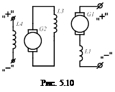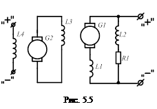 Трехобмоточным называют генератор, имеющий три обмотки возбуждения: независимую, параллельную и последовательную, действующую навстречу двум первым (см. рис. 5.5). Якоря тягового генератора G1 и возбудителя G2приводятся во вращение от дизеля, а обмотка возбуждения L4 получает питание от независимого источника (аккумуляторной батареи). Независимая обмотка возбуждения L3 тягового генератора может получать питание и от источника с постоянным напряжением, например, от аккумулятора.