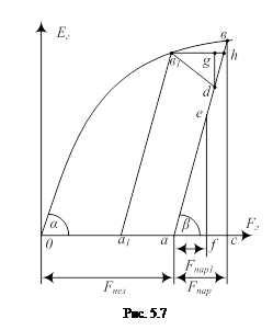 Влияние насыщения магнитной цепи на форму характеристик генератора удобнее выяснить путем графического построения их. Для качественного анализа, как и прежде, коэффициент кр принимается постоянным. Из равенства (5.2) следует, что при холостом ходе (Iг =0) н. с. генератора равна сумме н. с. независимой и параллельной обмоток. Отложив по оси абсцисс отрезки (рис. 5.7) 0а=Fнез и ас=Fпар, получим э. д. с. холостого хода генератора Ег =вс.