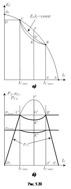 На рис. 5.20а линия ABGCD соответствует желательной предельной характеристике (см. рис. 102) при номинальной мощности РД ном дизеля (линия В'С' на рис. 1.77б). Для того чтобы обеспечить возможность использования полной мощности дизеля в пределах изменения тока генератора от IГмин до IГмакс, внутренняя характеристика генератора ЕГ(IГ) должна пройти через точки В и С. Пусть линия A1BFCD1 представляет собой внутреннюю характеристику генератора при номинальной угловой скорости пдном дизель-генератора. Соответствующий ей график мощности на валу генератора представлен линией А1′В'F'С'D1′ (см. рис. 5.20б).