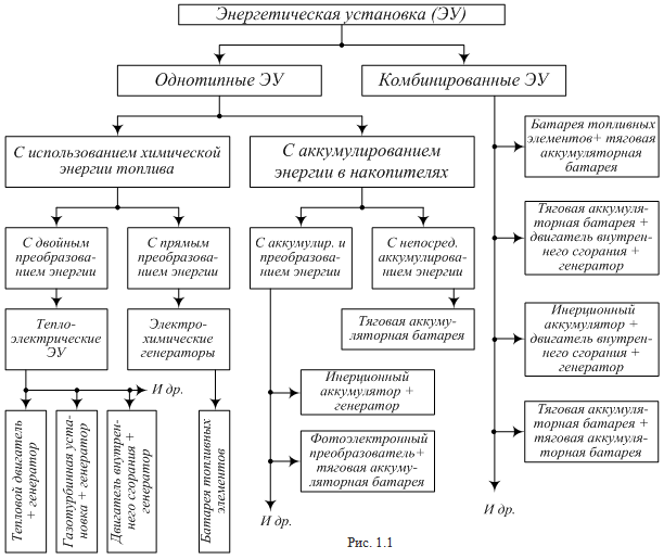 Применяемые на автономном транспорте энергоустановки весьма разнообразны и отличаются, как процессами преобразования, так и способами пополнения энергии. Основные виды энергоустановок приведены на рис. 1.1.