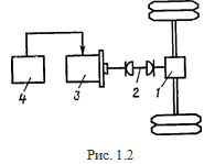 На рис. 1.2 приведена схема тягового привода автономного транспортного средства с ТАБ, включающая в себя редуктор с дифференциалом 1, карданный вал 2, тяговый электродвигатель 3, ТАБ 4.
