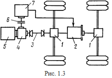 На рис. 1.4 приведена схема тягового привода, содержащего комбинацию из двух типов: механического и электрического для режимов трогания и разгона. Схема включает в себя редуктор с дифференциалом 1, карданный вал 2, муфту 3, тяговый электродвигатель 4, ДВС 5, ТАБ 6, блок управления 7.