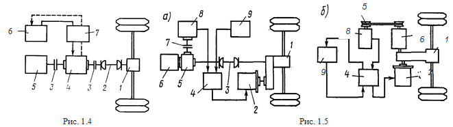 На рис. 1.5 приведены два варианта схемы тягового привода, содержащего комбинацию из двух типов: механического и электрического для режимов трогания и разгона. В отличие от предыдущего варианта схема включает в себя тяговый генератор 8, который может питать тяговый электродвигатель 2 параллельно с ТАБ 9. Вращение вала тягового генератора в схеме рис. 1.5а осуществляется, как и в варианте по схеме рис. 1.3, ДВС через раздаточный редуктор 5 и муфту 7, а в схеме рис. 1.5б – через передачу 5. Блок управления 4 позволяет осуществлять не только совместное и раздельное питание электродвигателя от ТАБ и генератора, но и подзаряжать ТАБ от генератора.