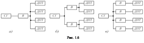 На рис. 1.6 приведены варианты структурных схем электрической части тягового привода четырёхколёсного самосвала с тяговыми двигателями постоянного тока (ДПТ) и синхронным тяговым генератором (СГ). Регулирование подводимого к двигателям напряжения осуществляется либо управляемым выпрямителем (В), либо возбуждением синхронного генератора. Из рисунка видно, что возможны три варианта построения схем, каждый из которых обладает своими достоинствами и недостатками. Наиболее приемлемой, как в плане реализации свойств тяговых двигателей, так и по надёжности работы привода в целом, является схема рис. 1.6в. Но она же требует и большего количества элементов.