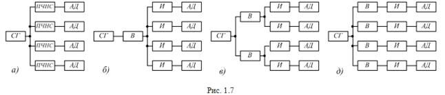 В варианте рис. 1.7а питание двигателя осуществляется через преобразователь частоты с непосредственно связью (ПЧНС), в остальных – через преобразователь частоты со звеном постоянного тока (ПЧПТ), состоящий из выпрямителя (В) и инвертора (И).