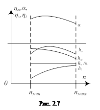 Коэффициент наполнения ηv вначале растет в связи с увеличением динамической слагающей напора, достигает максимума, а затем начинает падать вследствие все более значительного роста гидравлических потерь. Коэффициент избытка воздуха α изменяется аналогично и по тем же причинам. Поэтому отношение ηv /α остается приблизительно постоянным. Уменьшение α сначала благоприятно влияет на параметры термодинамического цикла, но затем препятствует полному сгоранию топлива и приводит к дымлению.