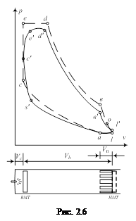 В четырёхтактном дизеле полный рабочий цикл соответствует повороту коленчатого вала теплового двигателя на 7200. диаграмма рабочего цикла такого дизеля приведена на рис. 2.5, где пунктиром нанесена диаграмма теоретического цикла.