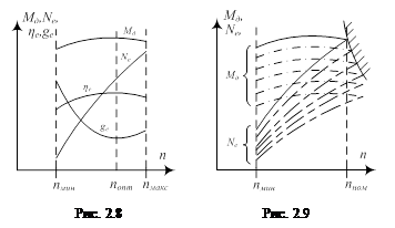 На рис. 2.8 приведены примерные внешние характеристики дизеля. В условиях работы на транспорте от дизеля далеко не всегда требуется полная мощность, соответствующая условиям работы по внешней характеристике. Очень часто приходится использовать неполную мощность, которой соответствуют уменьшенная подача топлива и частичные характеристики, общий вид которых показан на рис. 2.9.