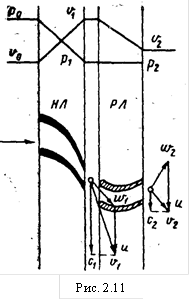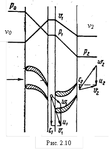 Турбины могут быть радиальными (центростремительными) или осевыми. По конструкции они подобны компрессорам, но имеют расширяющуюся по ходу газа проточную часть и отличаются формой лопаток. Турбины (в некоторой мере условно) разделяют на активные и реактивные. Активными турбинами называют такие, в которых используются центробежные силы, возникающие при протекании струй газа по криволинейному каналу, образованному рабочими лопатками. В таких турбинах преобразование потенциальной энергии газа в кинетическую происходит только в направляющих лопатках, а на рабочих лопатках давление остается примерно постоянным. Диаграмма рабочего процесса осевой турбины приведена на рис. 2.10. В направляющем колесе турбины сечение канала сужается, что ведет к повышению скорости газа (v1 > v0) и снижению давления(p1,<po). Одновременно изменяется направление скорости газа, что ведет к появлению окружной слагающей скорости. Потенциальная энергия газа преобразуется в кинетическую.