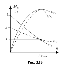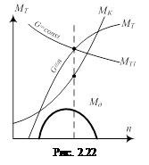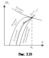 Момент компрессора, как гидравлической машины, сжимающей воздух, пропорционален квадрату угловой скорости установки. Момент турбины и характер его изменения от угловой скорости зависят от способа подачи топлива. МT1, характеризует изменение момента турбины при постоянной подаче топлива (G=const). По мере роста частоты вращения вала компрессор увеличивает подачу воздуха. Смесь обедняется и момент падает. Снижение скорости для увеличения момента возможно лишь до ограничения Tс макс (рис. 2.23). Режим при Tс макс, очевидно, окажется и наиболее экономичным, так как при изменении скорости и отходе от этого режима меняется коэффициент избытка воздуха.