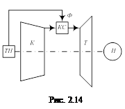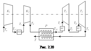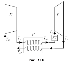 На рис. 2.18 приведена схема одновальной ГТУ с регенерацией тепла. Здесь воздух, сжатый компрессором, прежде чем поступить в камеру сгорания, проходит через регенератор Р, в котором он подогревается, отбирая тепло у отработавших в турбине газов.
