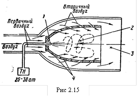 Схема простейшей одновальной разомкнутой газотурбинной установки представлена на рис. 2.14. Многоступенчатый осевой компрессор К сжимает воздух (обычно до πк = 5…6), который поступает в камеру сгорания. Одновременно в нее через форсунку Ф топливный насос ТН подает топливо, которое сгорает при температуре 1800…20000С. Для лопаток турбины Т такая температура недопустима, поэтому продукты горения смешиваются с избыточным воздухом и температура смеси снижается до 600…8000С. Схема камеры сгорания представлена на рис. 2.15. Подаваемый в огневое пространство 2 камеры сгорания через завихритель 4 воздух смешивается с топливом, впрыскиваемым через форсунку 1. После сгорания в пространстве 3 происходит охлаждение продуктов сгорания путём смешивания с воздухом, после чего они подаются в турбину. Коэффициент избытка воздуха в жаровой трубе камеры сгорания составляет обычно αвн ≈1,7…2,5, в то время как общий коэффициент избытка воздуха α0 ≈5…10.
