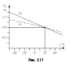 Теоретическая мощность компрессора составляет около 2/3 мощности турбины, а мощность на выходном валу ГТУ равна около 1/3 мощности турбины. Значения внутренних и механического КПД сильно влияют на выходную мощность и общий КПД ГТУ. Существенно влияет на мощность и КПД ГТУ температура воздуха перед компрессором. На рис. 2.17 за единицу приняты значения, отвечающие температуре окружающей среды 20° С.