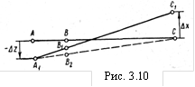 Пусть рычаг 9 (см. рис. 3.9) занимает в установившемся режиме положение АВС (рис. 3.10) и в переходном процессе – положение A1B1С1. Перемещение рычага можно представить состоящим из двух поворотов: около точки С до положения A1С и около точки A1 до A1C1. Пренебрегая разницей между дугами и хордами, можно найти смещение золотника от установившегося положения из уравнения