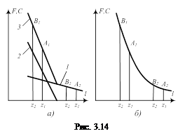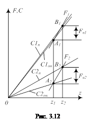 Настройка регулятора изменяется посредством перемещения опоры 1 (см. рис. 3.12) измерительного органа. При этом сила сжатия пружины меняется, но жесткость цилиндрической пружины сохраняется и, следовательно, характеристика поддерживающей силы в зависимости от перемещения муфты переносится параллельно самой себе. При номинальной угловой скорости двигателя центробежная сила имеет наибольшую величину. Поэтому пружина должна иметь минимальную длину, т. е. опора 1 занимает самое нижнее положение. Поддерживающая сила F1 при этом имеет наибольшую величину (линия A1B1 на рис. 3.12). Центробежные силы, соответствующие минимальной (z2) и. максимальной (z1) подаче топлива, изображены прямыми 0А1 и 0В1.