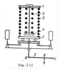 Простейшая кинематическая схема двухрежимного регулятора прямого действия изображена на рис. 3.15. Для поддержания малой скорости при холостом ходе служит пружина 3. При ограничении максимальной скорости вводится более жесткая пружина 2. Рычаг 6 шарнирно соединен с рейками топливных насосов (точка С), с муфтой 5 измерителя (точка А) и приводом управления (точка В). Схема изображена для случая, когда орган управления установлен в положение холостого хода, которому соответствует определенное положение привода, т. е. точки В. Если при работе без нагрузки момент сопротивления потерь или крутящий момент двигателя изменяется, отклонение угловой скорости меняет положение точки А при неподвижной точке В и подача топлива изменяется как в обычном регуляторе прямого действия. Величина поддерживаемой угловой скорости определяется силой нажатия пружины 3.
