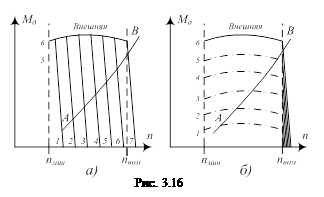 Характеристики момента дизеля с многорежимным регулятором (рис. 3.16 а) представляют собой сетку регуляторных характеристик, число которых при ступенчатом управлении равно числу положений органа управления, а наклон определяется степенью статизма регулятора; при изодромном регуляторе они вертикальны. Регуляторные характеристики ограничиваются сверху внешней характеристикой дизеля, получаемой при предельном положении исполнительного органа регулятора. Работа дизеля под нагрузкой возможна в любой точке каждой из характеристик и определяется моментом сопротивления нагрузки (линия АВ), а также положением органа управления, которым задается угловая скорость; подачу топлива устанавливает регулятор.