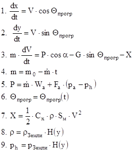 Таким образом необходимо определить параметры движения ракеты на активном участке . Для этого составим систему уравнений :