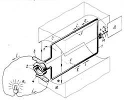 1 — рамка (виток); 2 — коллектор; 3,4 — щетки; С, Ю — постоянные магниты; Д — двигатель