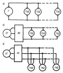 Рис. 48. Структурные схемы тепловозных электрических передач постоянного тока (а), переменно-постоянного тока (б) и переменного тока (в):