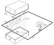 Величина индуктируемой в проводнике П э.д.с. Е определяется законом электромагнитной индукции (законом Фарадея*) и зависит от индукции В, скорости V перемещения проводника и его длины l, т.е. Е = В∙V∙l. Теперь, если движущийся проводник П включить в замкнутую электрическую цепь с потребителем энергии (например, с электрической лампочкой, обладающей сопротивлением Rл), то по цепи будет протекать электрический ток I, о чем свидетельствует горящая лампочка (см. рис. 49).