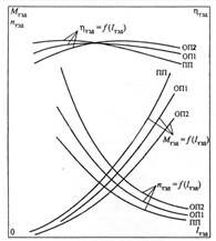 На рис. 58 приведены электромеханические характеристики тепловозного двигателя для полного поля (ПП) и двух ступеней ослабления магнитного потока возбуждения (ОП1 и ОП2).